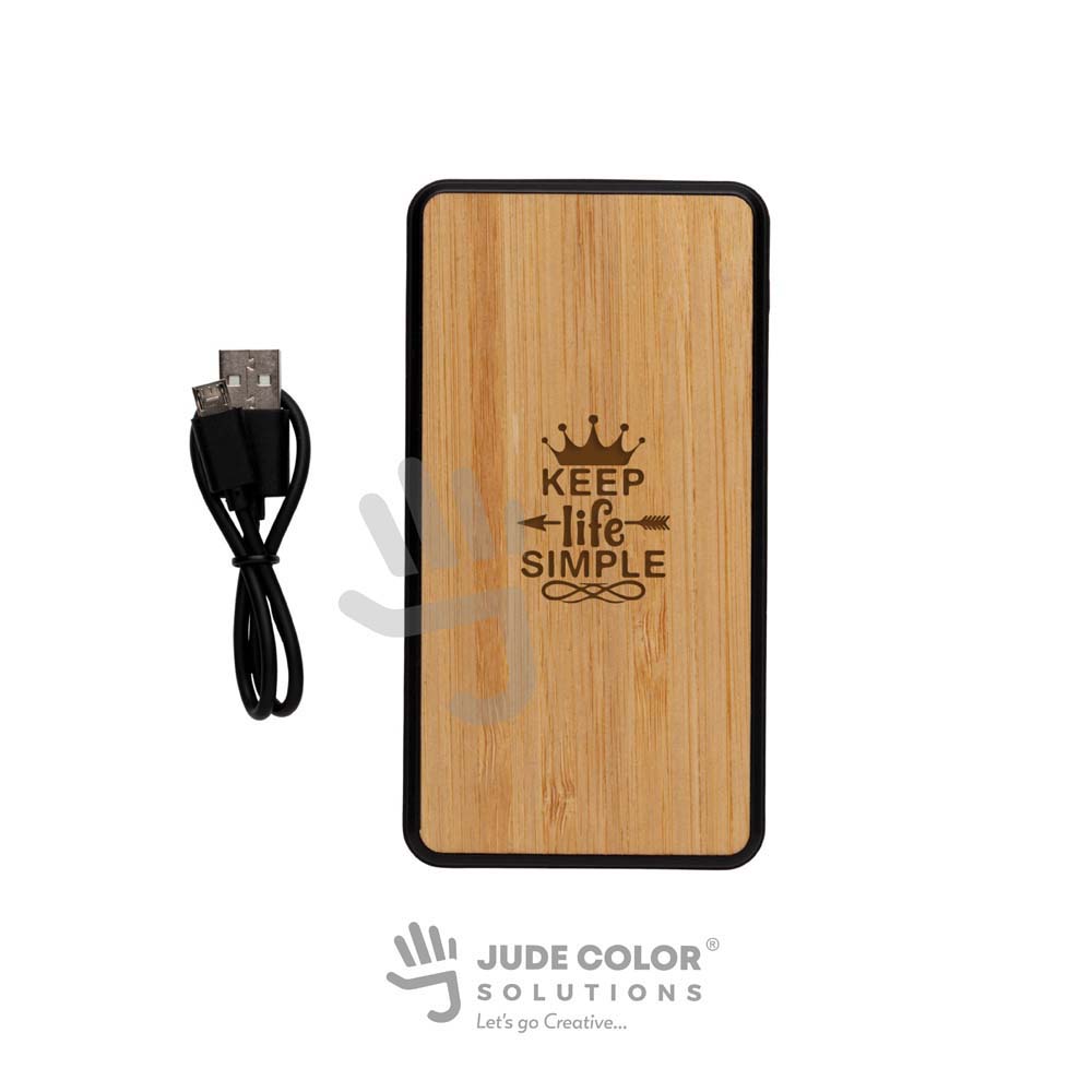 This 8000mAh power bank is made out of natural and sustainable bamboo with a soft touch polymer finish. It can be charged via both micro USB and type C and supports both wireless charging and charging via USB port by cable. When fully charged, it can re-charge your mobile phone up three times. It also has LED indicators that will show the remaining energy level so you always know when to re-charge. To charge the Power bank, plug the micro USB or type C charger into your wall charger or computer USB port. The USB connector goes to the wall charger and the micro USB or type C goes to the power bank! Use the supplied micro USB cable when charging the power bank to avoid damaging it. To charge your mobile device, plug your cable into the USB port on the power bank and the other end of the cable unto the phone. Your phone will charged to near full capacity in like two hours. For wireless charging, make sure that your phone is compatible for wireless charging, then switch on the power bank using the power button on the sides the place your device on the wireless charging surface of the power bank!. It can be personalised with your brand logo, a nice quote or a precious message. It is perfect for gift-giving to the corporate clients, employees as a Token of appreciation, to friends on their birthdays, anniversaries and as well as promotional give away items.